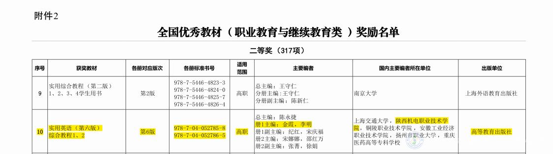 我校名师工作室主持人、基础部李明副教授主编的《实用英语综合教程(第六版)》荣获全国优秀教材(职业教育与继续教育类)二等奖。这是我校在教材建设成果上取得的新突破。