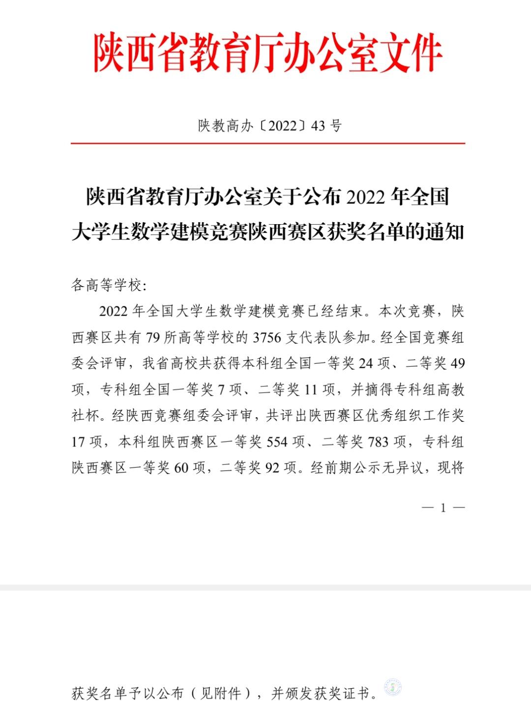 陕西机电职业技术学院在2022年全国大学生数学建模竞赛中荣获专科组全国一等奖