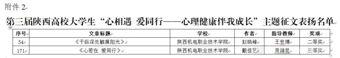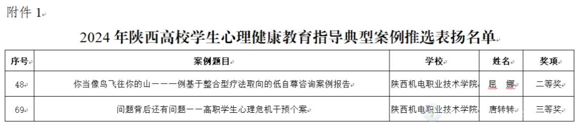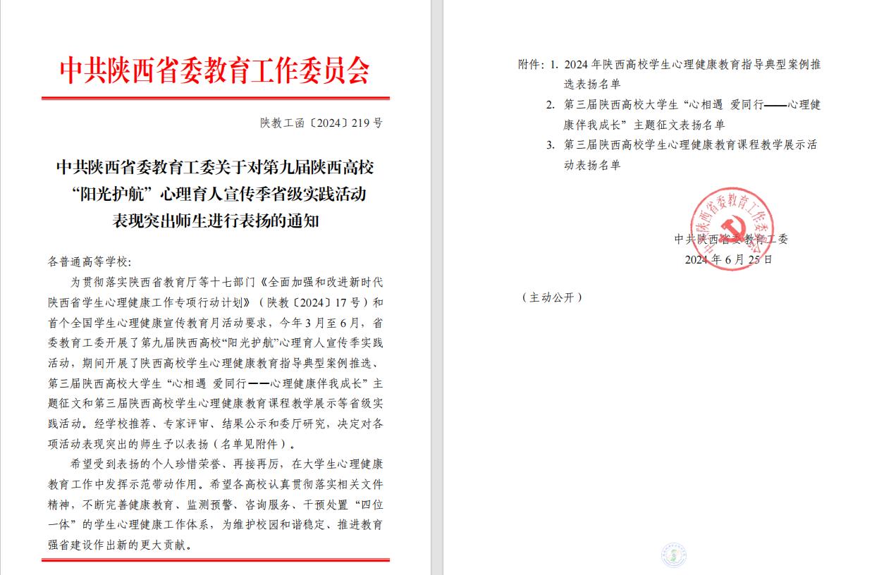 近日,《中共陕西省委教育工委关于对第九届陕西高校“阳光护航”心理育人宣传季省级实践活动表现突出师生进行表扬的通知》公布,我校教师屈娜的《你当像鸟飞往你的山——一例基于整合疗法取向的低自尊咨询案例报告》和教师唐转转的《问题背后还有问题——高职学生心理危机干预个案》分别荣获典型案例二、三等奖;由学生赵晓峰撰写、教师王世璟指导的文章《于纵深处触摸阳光》和学生戴佳艺撰写、教师周靖昆指导的文章《心若在 爱同行》分别荣获第三届陕西高校大学生“心相遇 爱同行——心理健康伴我成长”主题征文二、三等奖。