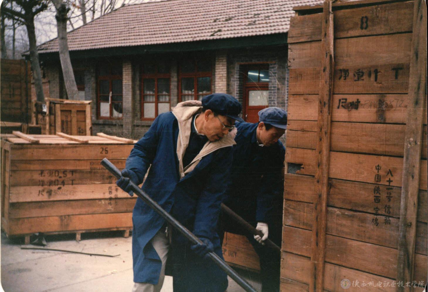 1988年12月5日 教工拆封设备 (后面平房是学校仅有办公教学地点)